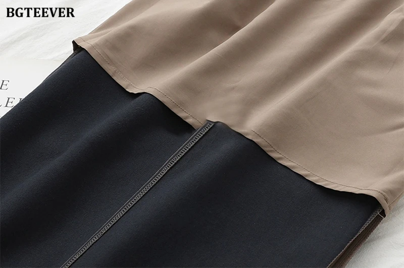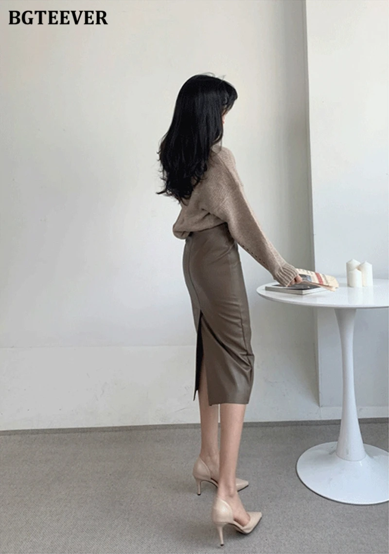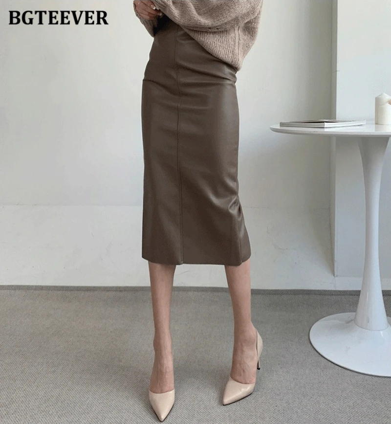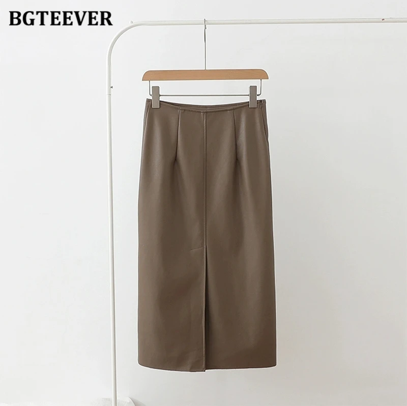 BGTEEVER Stylish Package Hip PU Leather Skirts for Women Autumn Elegant High Waist Slim Split Ladies Pencil Skirts