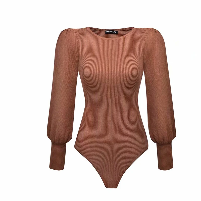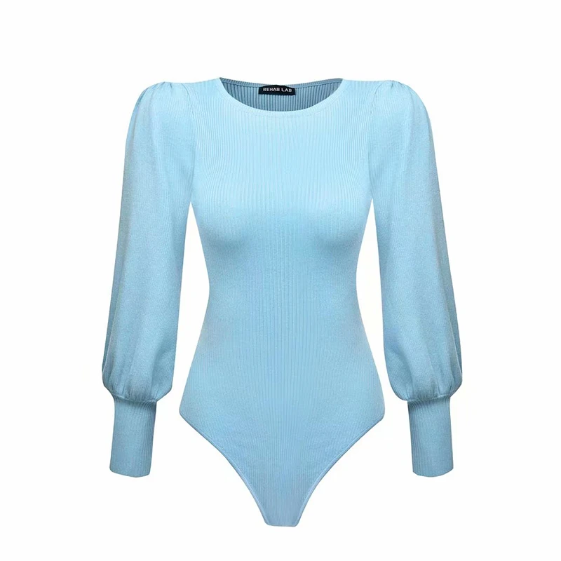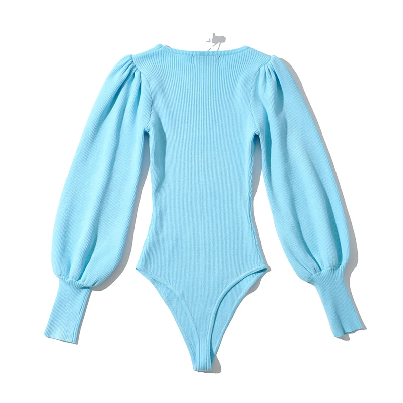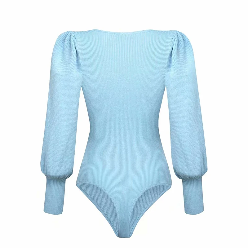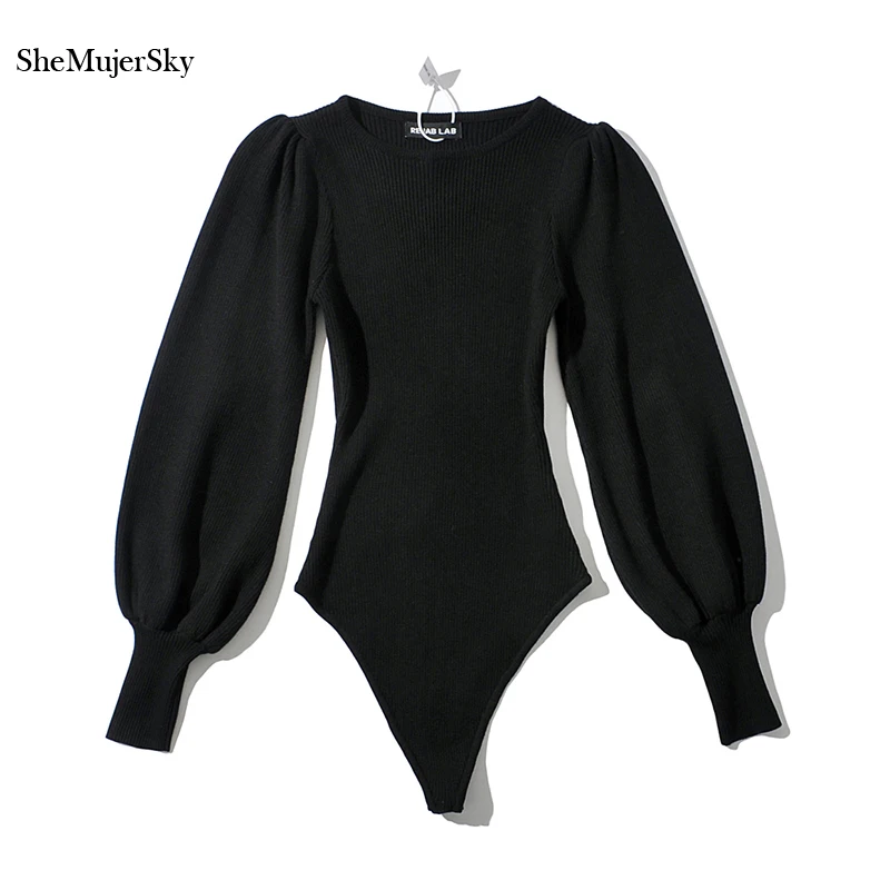 SheMujerSky Women Knitted Solid Color Bodysuits Puff Sleeve Elastic Slim Jumpsuits 2021 Long Sleeve Bodysuit