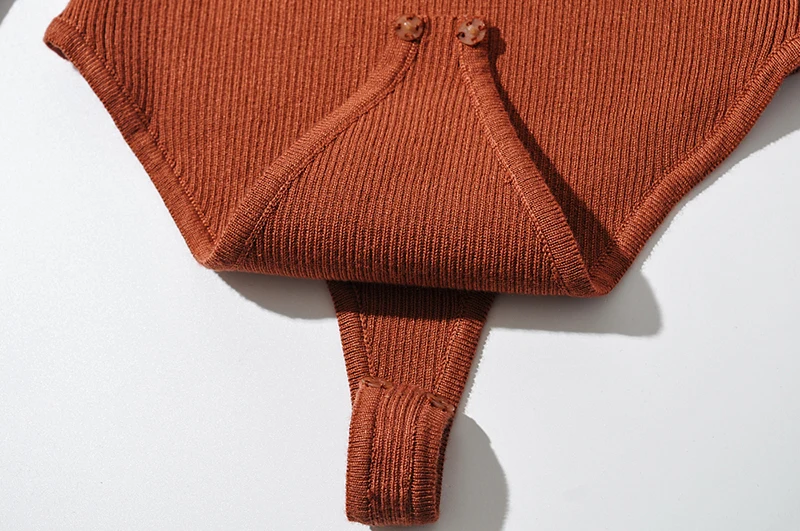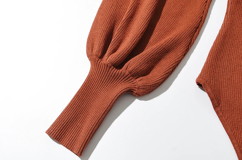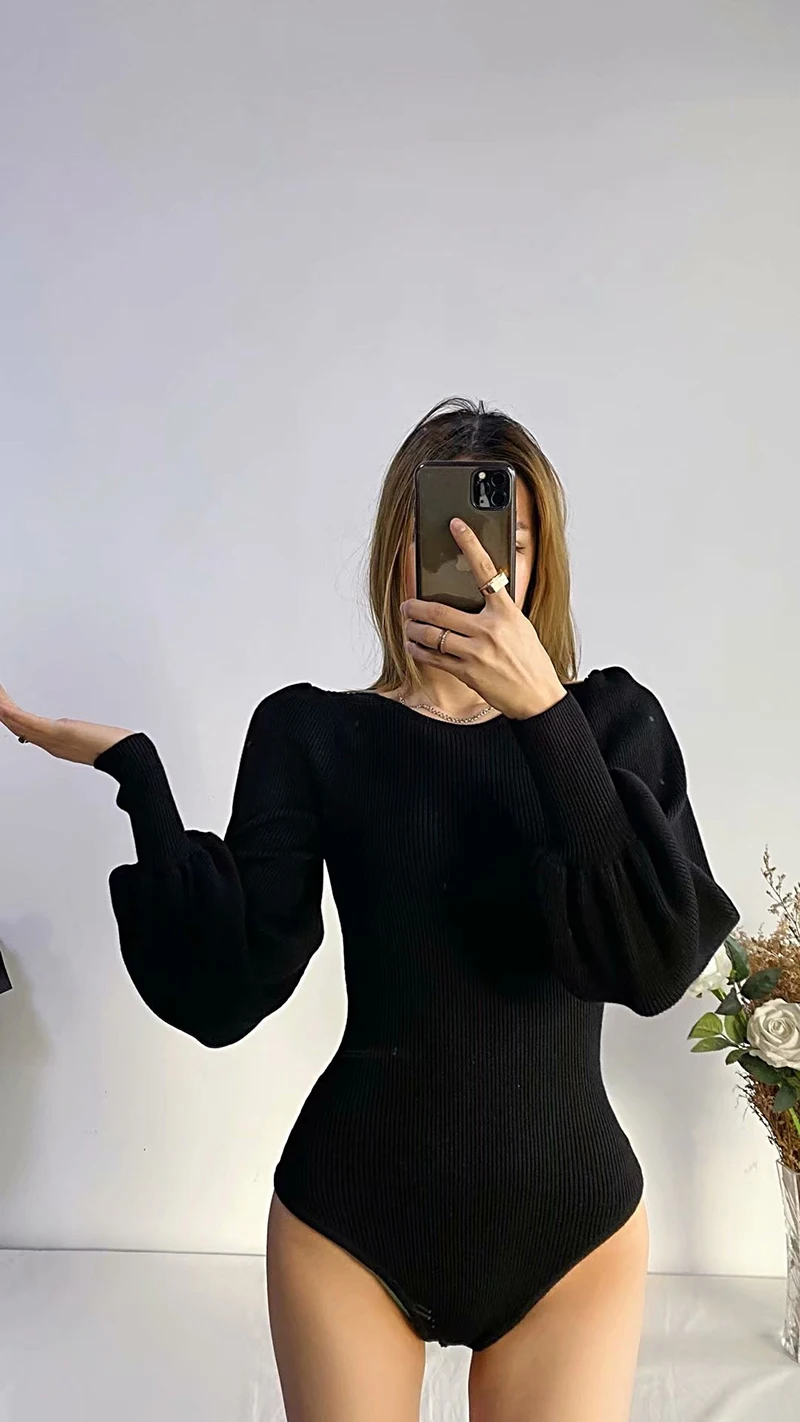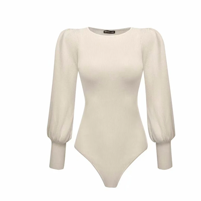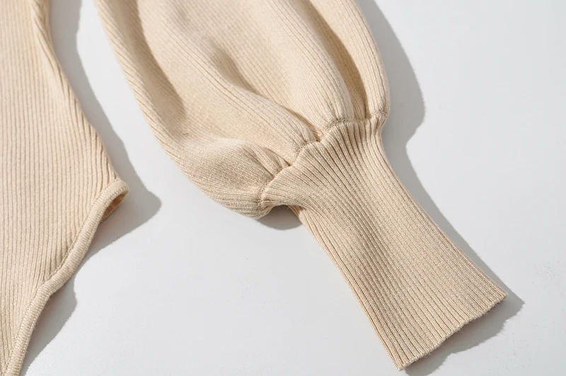 SheMujerSky Women Knitted Solid Color Bodysuits Puff Sleeve Elastic Slim Jumpsuits 2021 Long Sleeve Bodysuit