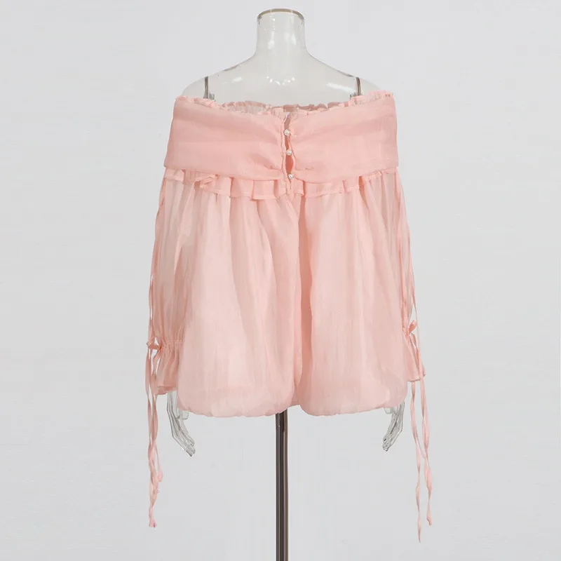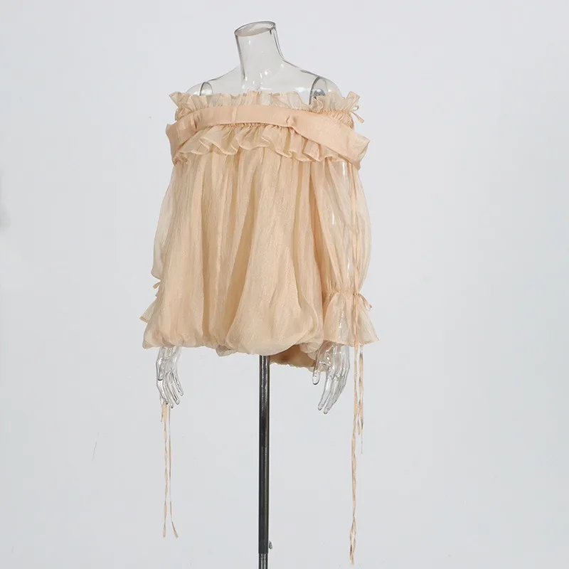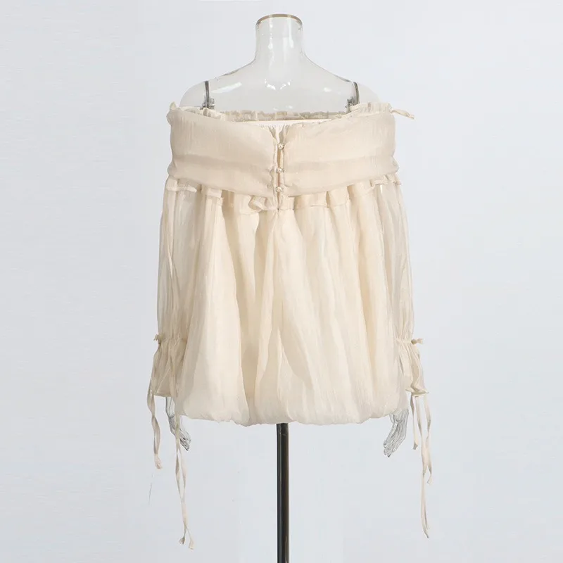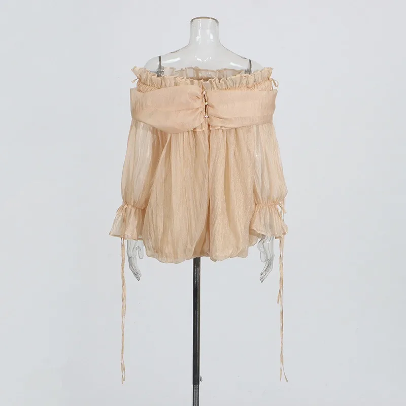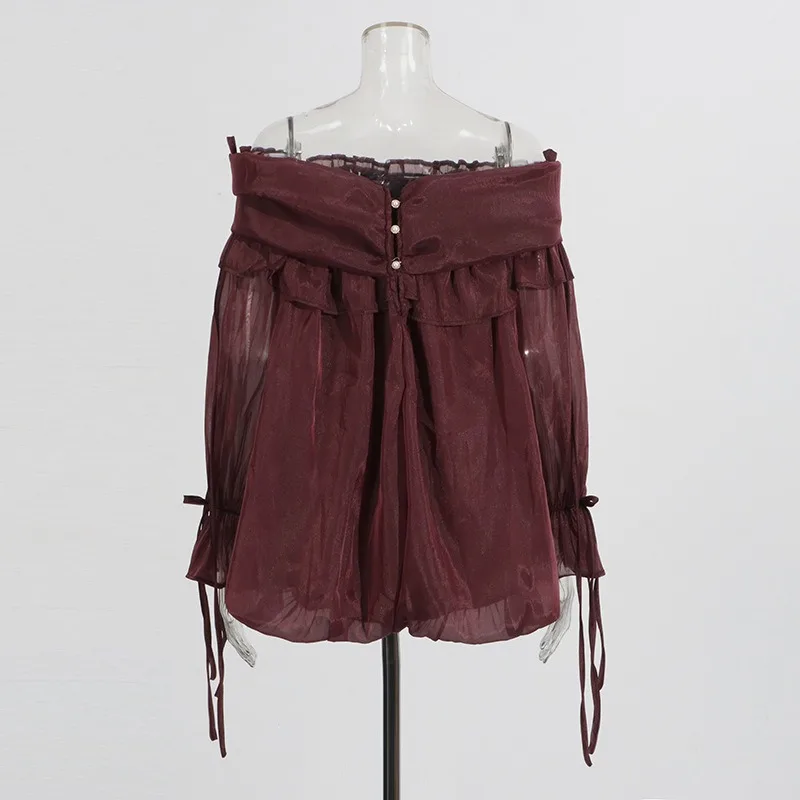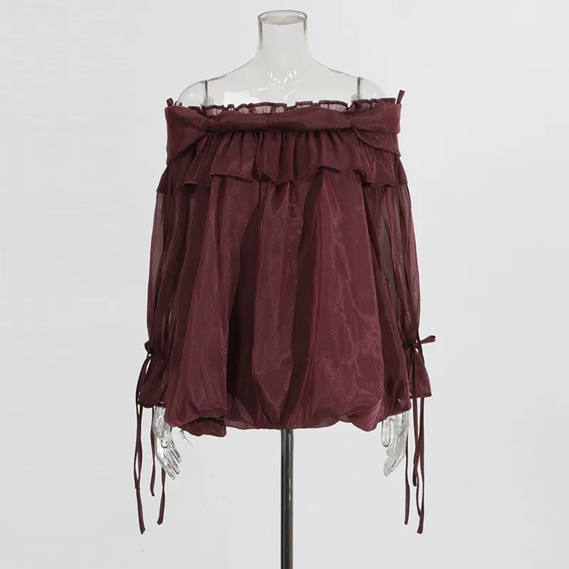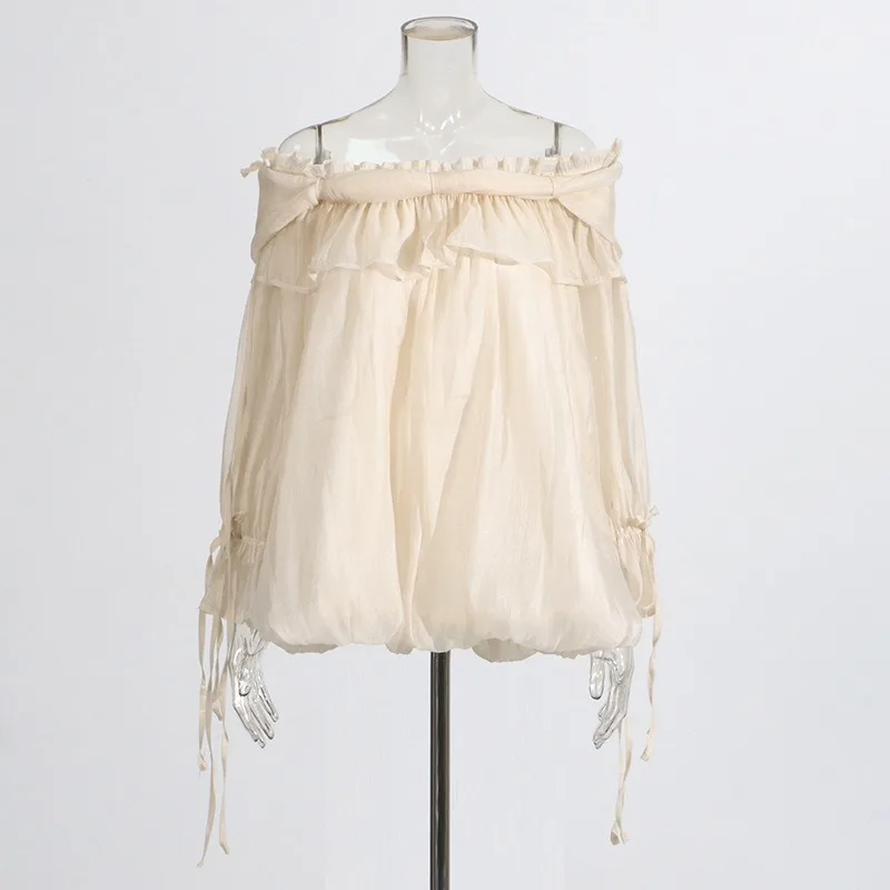 SXTHAENOOLoose Elegant Solid Blouses For Women Slash Neck Off The Shoulder Sleeve Spliced Folds Temperament Blouse FemaleFashion