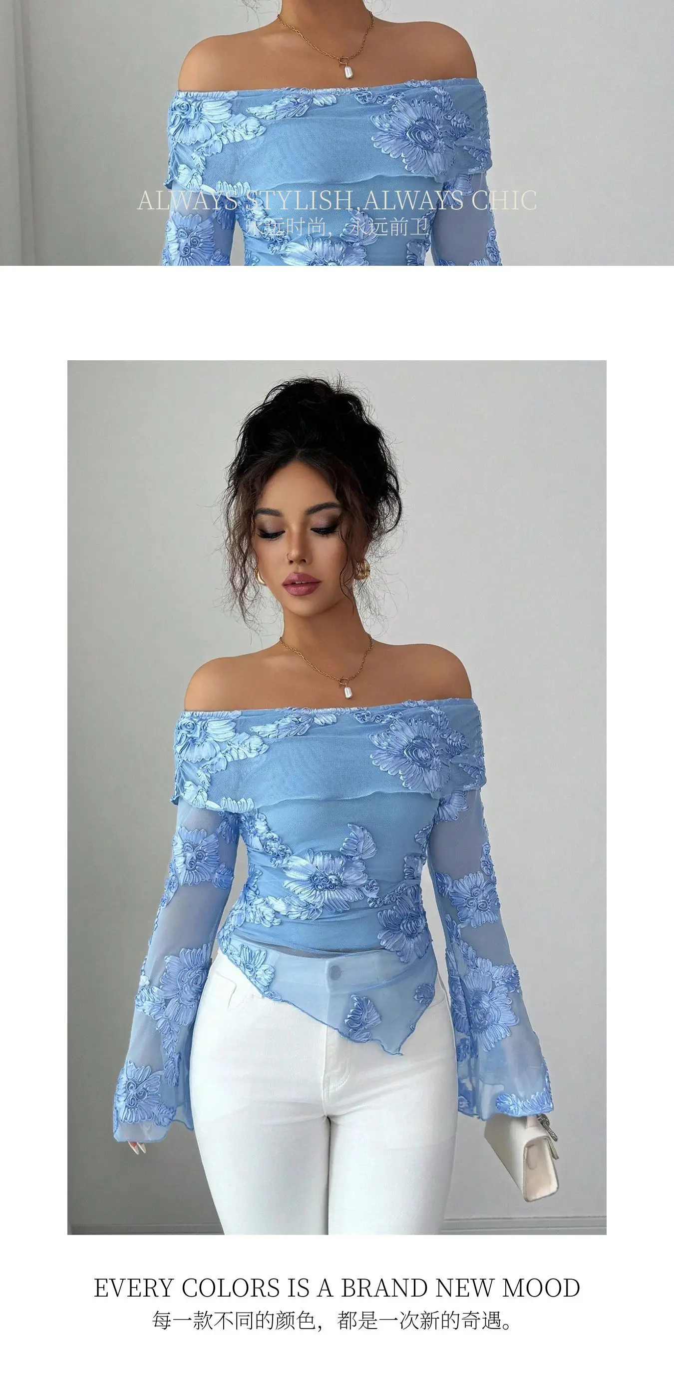 Versatile And Stylish Top For Women T Shirt One-shoulder Collar Flared Sleeves And Asymmetrical Hem Embroidery