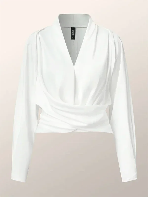 Women's Long Sleeves Solid Color Zipper V-neck Blouses Tops Urban Fashion Pleated Casual Office T-shirts