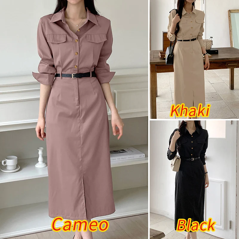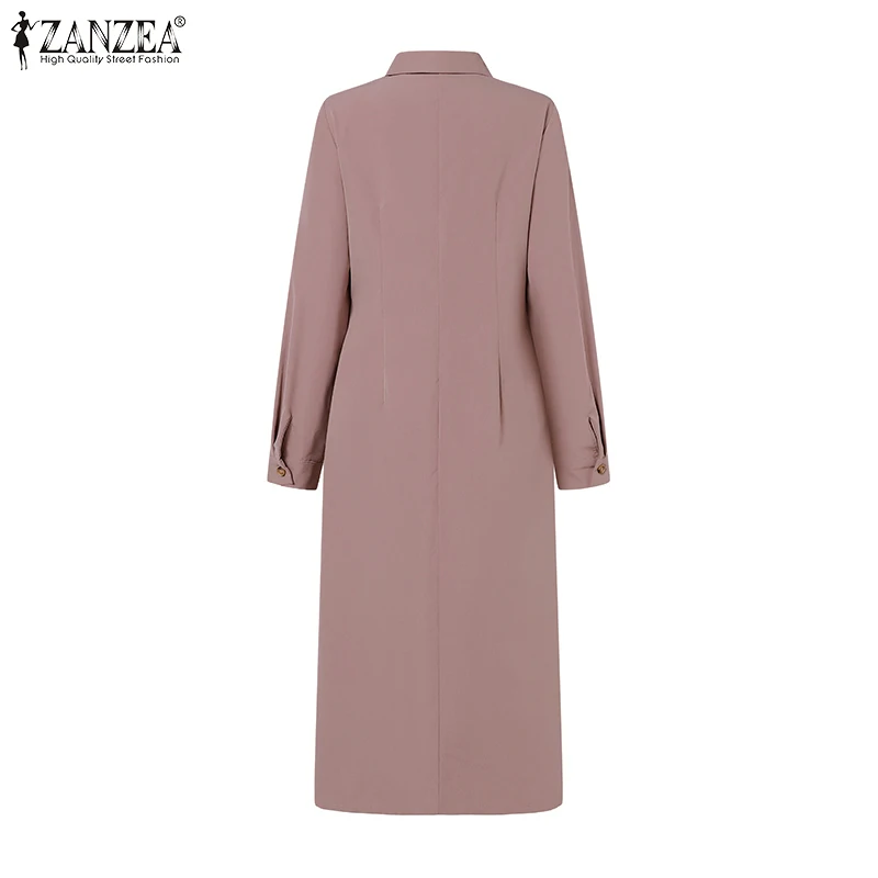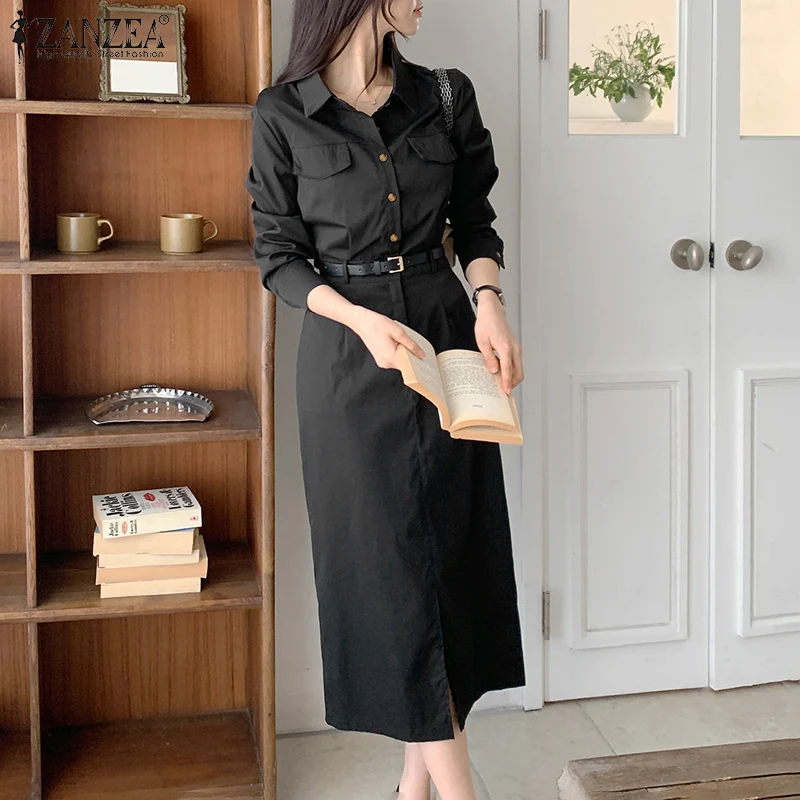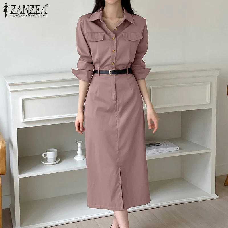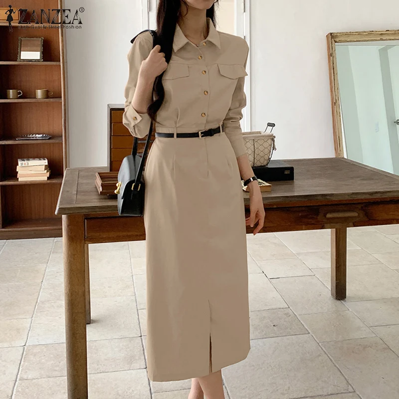 ZANZEA Women Lapel Long Sleeve Vestidos 2025 Spring Solid Work Dresses Casual Waisted No Belted Robe Office Lady Midi Spilt Robe
